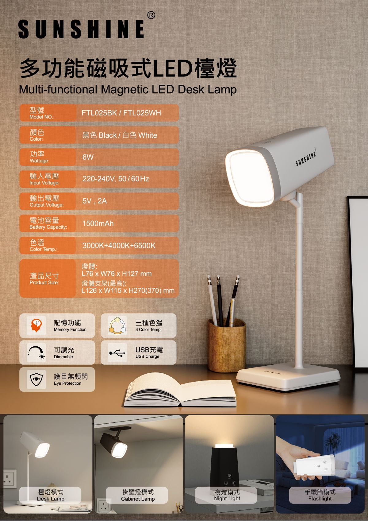 – 一燈多用,檯燈模式,排壁燈模式,夜燈模式,手電筒模式